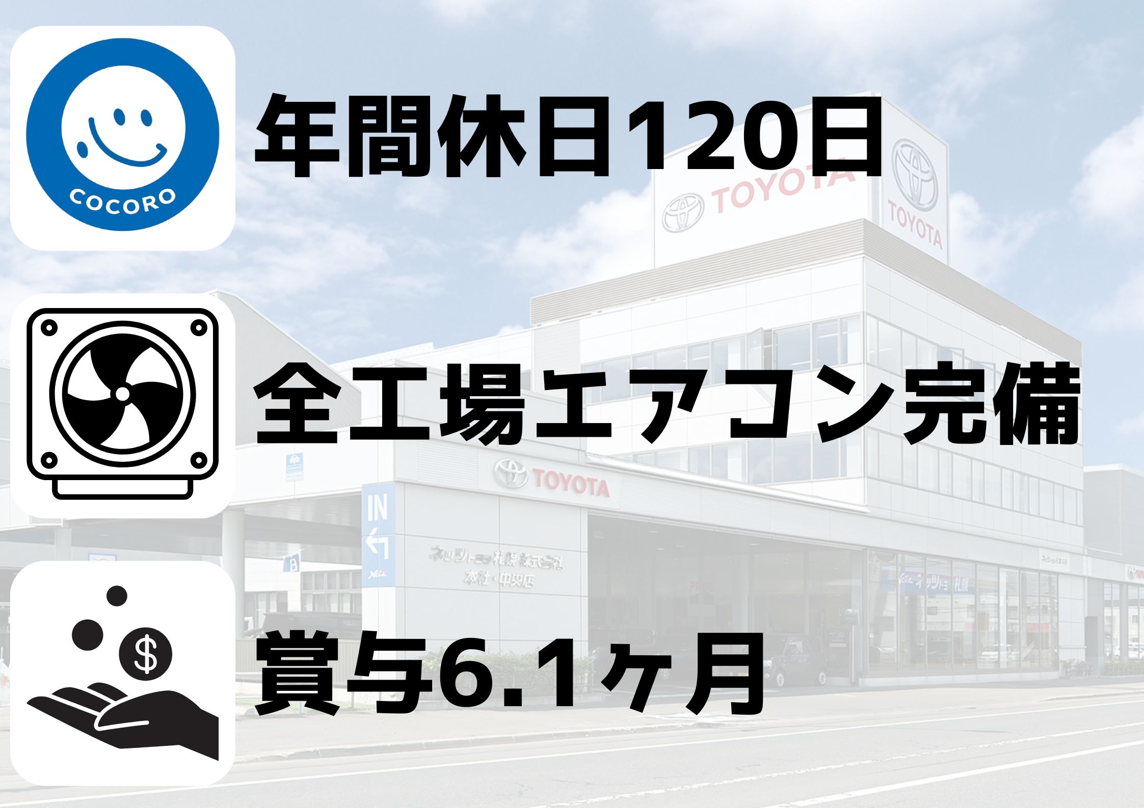 その中でもしネッツトヨタ札幌に興味を持ってもらえたら、明るく楽しい先輩方が待っていますので、ぜひ一緒に働けるのを楽しみにしています。